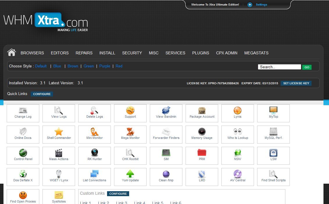 Turbo charge your WHM with Xtra Ultimate Pro Suite which adds over 160+ tools to WHM and cPanel, all of which can save you hours of time and tons of money when it comes to securing, repairing and managing your server. It.s perfect for the single user new to servers or even an experienced admin who wants to save time and get things done quickly. Datacenters like SingleHop and Hostdime also provide Xtra to their clients to save techs time for more serious issues. Works on any server with WHM/cPanel and installs with a single command! Fully compliant with cPanels new AppConfig.